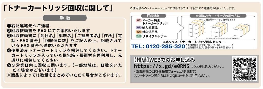 使用済みのトナー回収はできますか?2026年1月8日 更新エネックストナーカートリッジ回収センターにて回収を承っております。詳細はカタログ(P70)をご覧ください。 回収対象:メーカー純正品、輸入純正品、対応汎用品、リサイクルトナー エネックス トナーカートリッジ回収センターTEL:0120-285-320(受付時間:平日9:00~17:00※土日祝祭日及び、夏季休業・年末年始を除く)