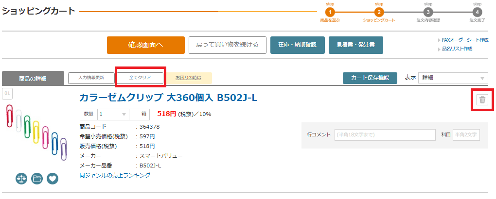 カートに入れた商品を削除するにはどうすればいいですか?2025年12月1日 更新カート内、商品詳細右上の、ゴミ箱アイコンをクリックしてください。 カート内の商品を全て削除する場合は、1行目の商品名上部の「全てクリア」で削除できます。
